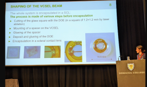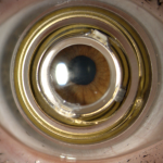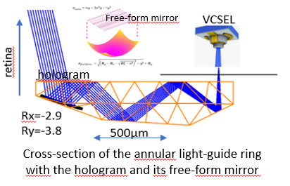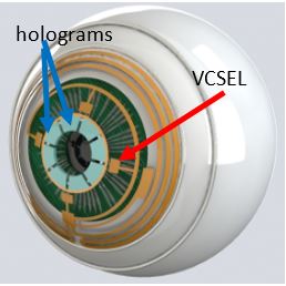 Cylensee PRAR embeds an annular lightguide ring with 4 lasers illuminating 8 different holograms projecting icons, warnings or patterns (i.e. few hundred possible combinations) on the parafovea, independently of the eye movements (see below) and blinks.